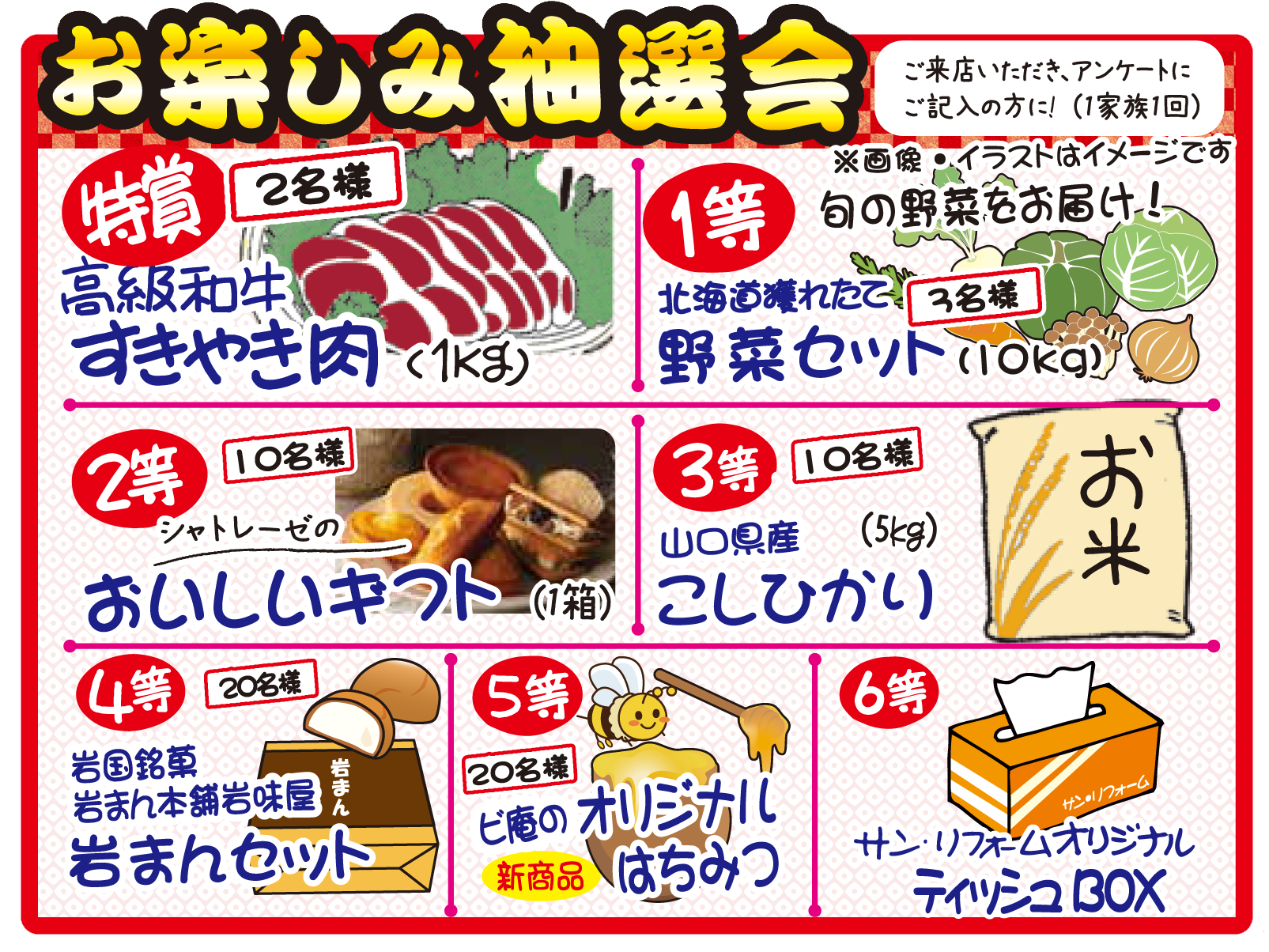 受付アンケートにご記入された方なら一世帯一回どなたでも引ける抽選会です!