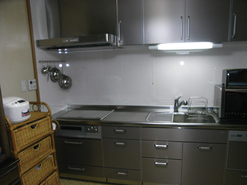 | 憧れのオールステンレスのシステムキッチンに。今まで表に出ていたキッチン用品がすべて収納でき、スッキリとしました。 キャビネットもオールステンレスでお掃除がグンと楽になりました。 |