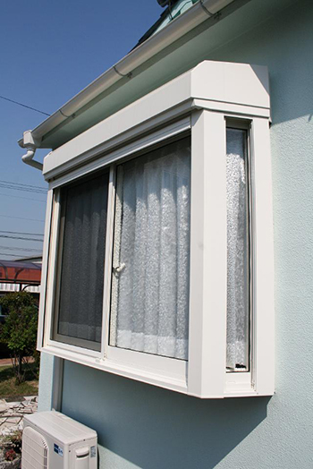 | 外側に75cm増築しました。雨戸シャッター付の白い出窓がアクセントに。 | 出窓のガラスに施主様こだわりが。お部屋に差し込む日差しが優しくなります。 |
