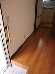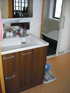 | 施工後、勝手口のあった場所は玄関の内側になりました。 | 「本当はすべて段差の無い完全バリアフリーにしたかったんです...。」と、営業担当の稲田。勝手口の土間があった部分の大きな段差は、随分と解消はされたものの、段差は少し残るカタチに。洗濯機を設置してある床の高さに揃えると、どうしてもこの段差は生まれてしまうそう。 | S様最初のご依頼工事。洗面所と浴室の施工後の様子です。この時は他にトイレ・テラス・屋根・エコキュート等の工事も施工されています。 |