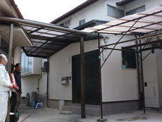 | 駐車場からお家へすぐに入ることができます。 | 次にご依頼されている、倉庫のドアクローザーの取替えについてご夫妻と打ち合わせ中...。 | 今までは外の倉庫に置いてある下駄箱を利用していたそう。裏玄関に新設した下駄箱は、天板が輝く格調高いものに。 |