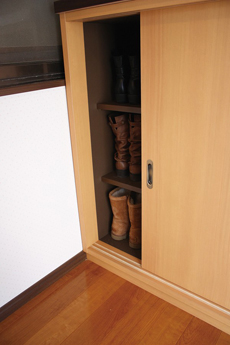 | 一番左の列は、ブーツの高さに合わせて棚板の位置を決め使い勝手も抜群。 |
