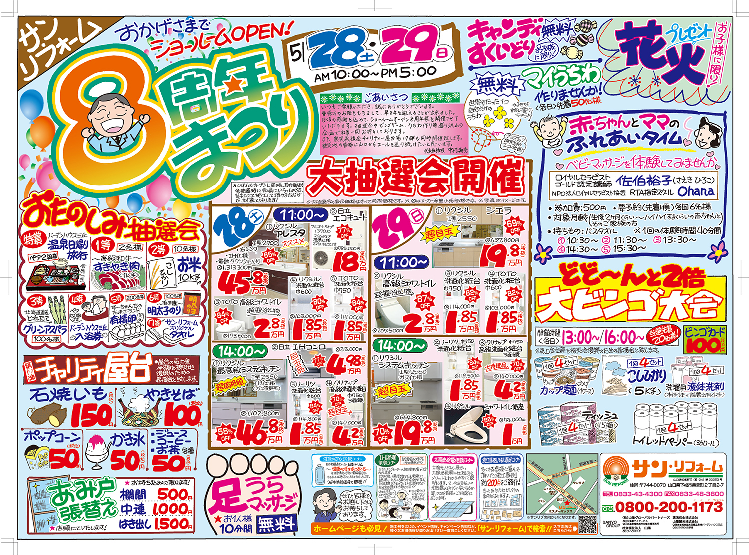| 屋台・ビンゴ大会の売上金全額を被災地復興のための義援金に!の趣旨のもと5月28日(土)・29日(日)の2日間、ショールームイベント「新春リフォーム祭」&「第17弾・震災 義援チャリティー屋台」を開催いたします。 イベント期間中は10時open~17時closeとなります。 |