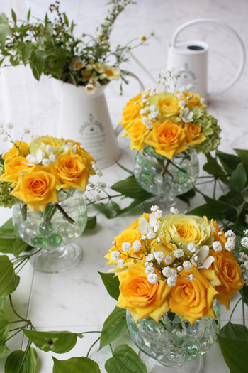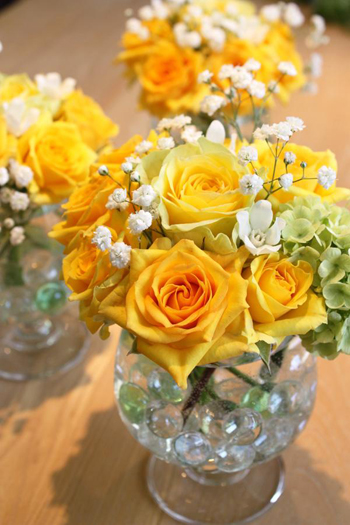 ガラスコップにビー玉を入れ、バラを活けるだけという、シンプルなものに!