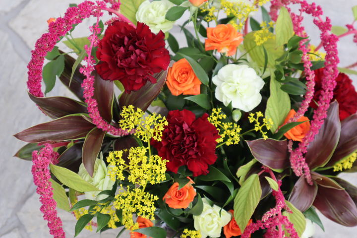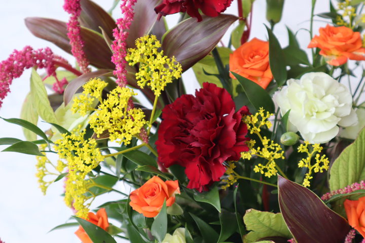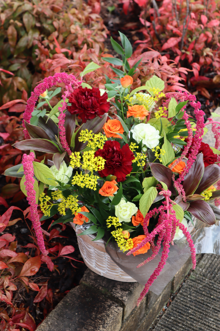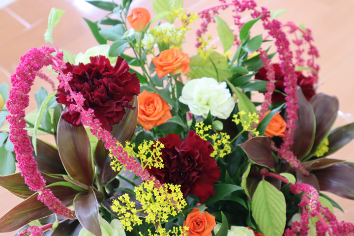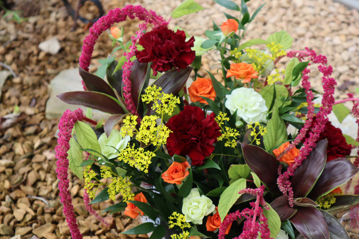 ヒモゲイトウを最初に選び、そこから赤いカーネーションや