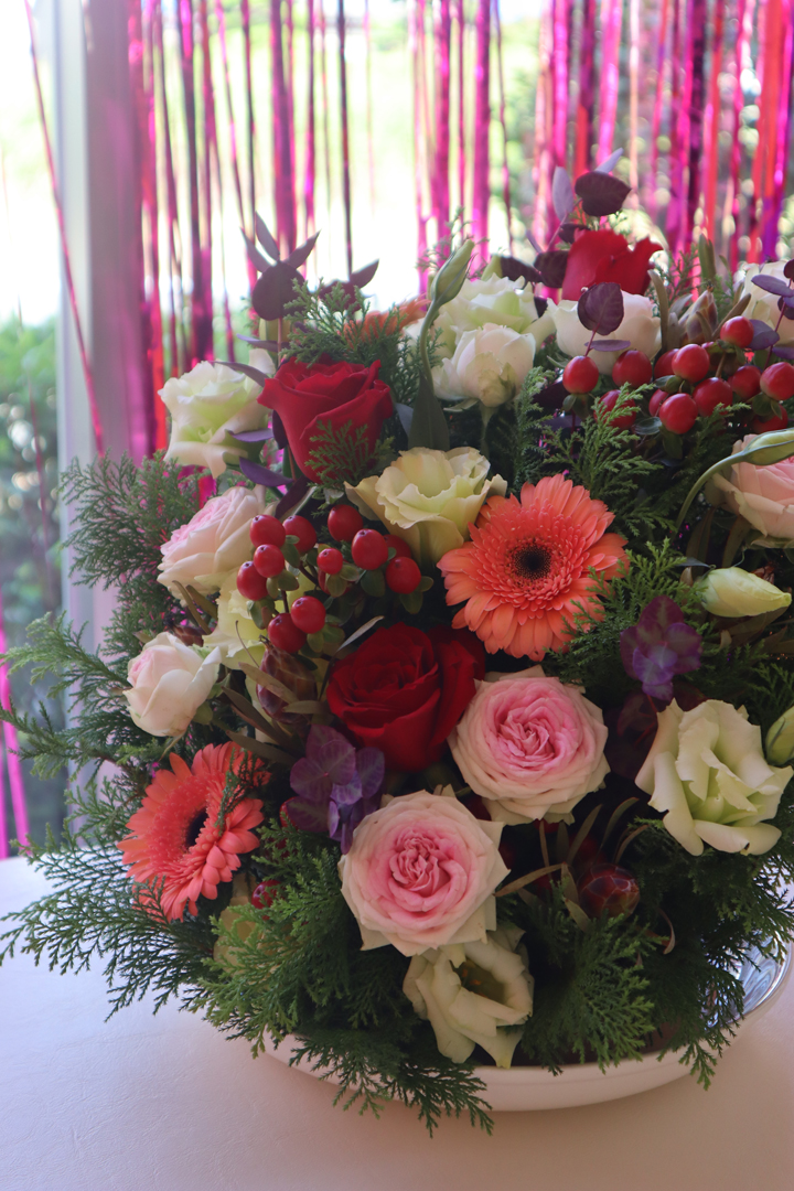 赤と白、ピンクのグラデーションが美しいスプレーバラ。
