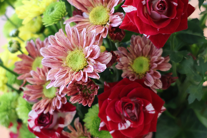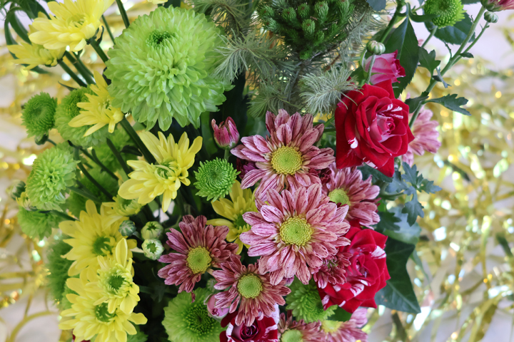 ありがとうのアレンジ花でよく使われるピンポンマム。可愛らしい丸い姿が花々を引き立てます。