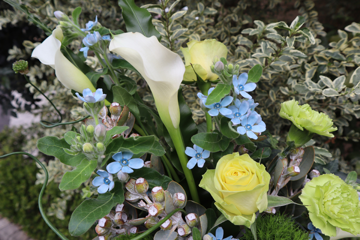カラーリリー、オキシペタラム、カーネーション、バラ、ユーカリなど