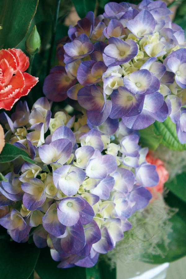 今回も、ショールームの庭に咲いているあじさいを使ってアレンジしました。