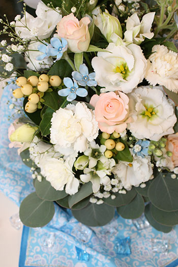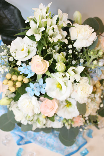 かすみ草をちらちらと降る雪のように大きい花の近くに入れてみました。