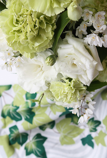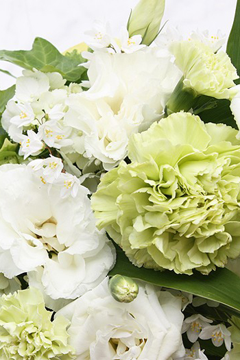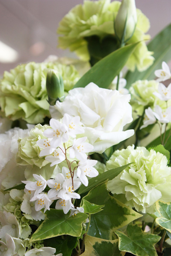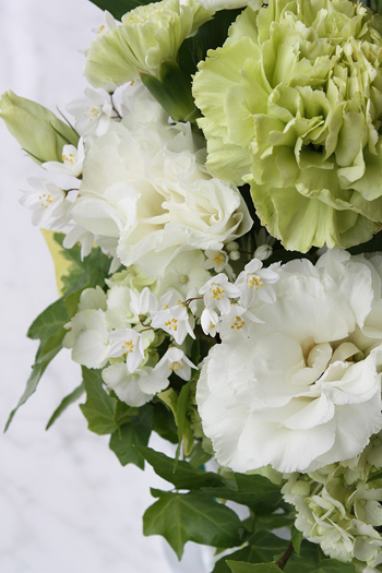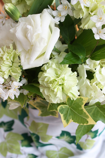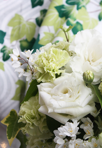 グリーンを中心に活けようと思い、カーネーションとあじさいはすぐに決まりました。トルコキキョウは薄い黄色と白とで、とても悩みましたが...やはり、グリーンを目立たせるのは白だ!ということで白いトルコキキョウにしました。