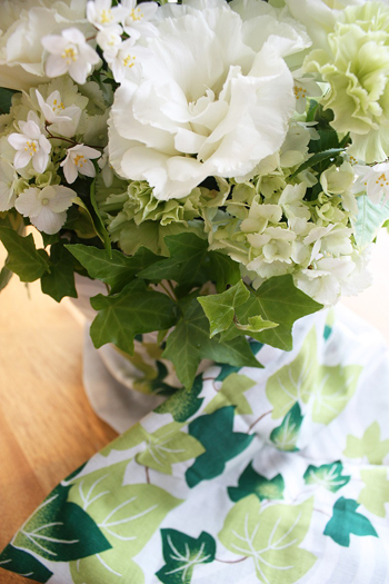 ショールームの庭の姫空木も間に入れることで、とても爽やかな感じに仕上がったと思います。今回は手ぬぐいの柄がアイビーなので、ショールームの庭のアイビーとコラボさせてみました♪毎回遊び心いっぱいで活けています!