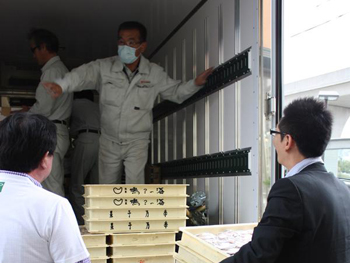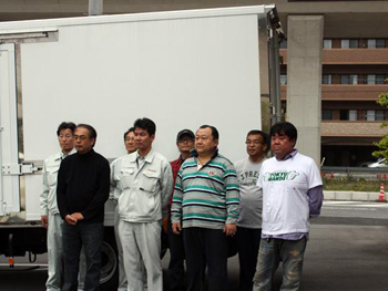 冷凍(冷蔵)トラックをチャーターしました。(←3トントラックに荷物を詰め込みます。) |