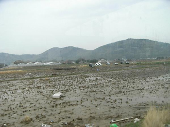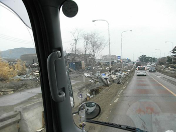 | 5月1日の朝、宮城県女川町に入りました。下松を出発してから、ほとんど休息なしで約17時間の道のりでした。 | 想像を超えた情景に...絶句...(田んぼの中に、津波で流された車たちがゴロゴロと...) 本当に悲惨で目をそむけたくなる風景が延々と続いていましたが...どうしてもシャッターをきることができませんでした...被災地の現状を伝えることも大切...とは思うのですが... |