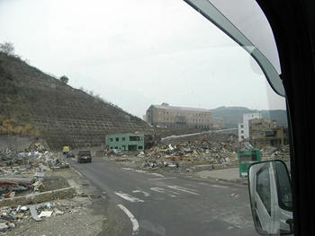 | 1日目の炊き出しの場所、「女川町総合体育館」の近くです。(総合体育館が見えた!と勘違いし撮影。この画像の真ん中、高台にある大きな建物は病院。この施設は周囲より高い位置にありますが、それでも津波はここまで押し寄せていました。) これ以降...シャッターボタンは押せませんでした...「女川町総合体育館」はこの病院の前を通って5分ぐらい先に行った所にあります。 |