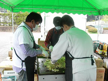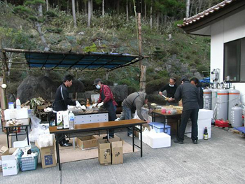 | 同じ日に、旅館「海泉閣」でも炊き出しをしました。設営時間、調理時間、初日に比べかなり短くなりました。 合間に、女川町の「ボランティアセンター」へも行き、焼きそばとどら焼きを、「旭ヶ丘集会所」と「第一保育所」の子ども達にお菓子とどら焼きを配りました。 |