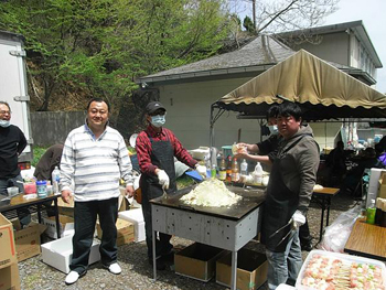 | 炊き出し2日目。「女川第3小学校」にて。 | 昨日1000人前の焼きそばを作ったこともあり、全スタッフかなり腕前をあげました。 |