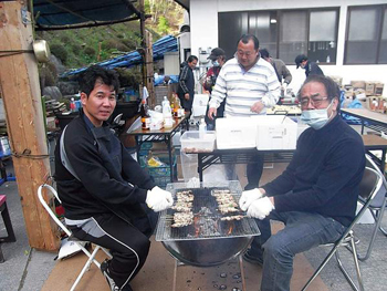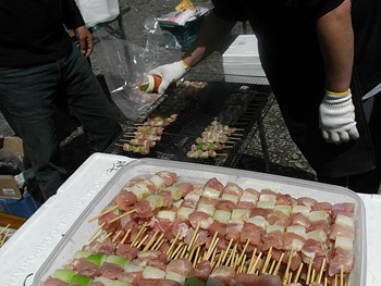 | 焼きそばに加え、山口自動ドア様からいただいた焼きとり500本も登場。炭火で焼きます。 |